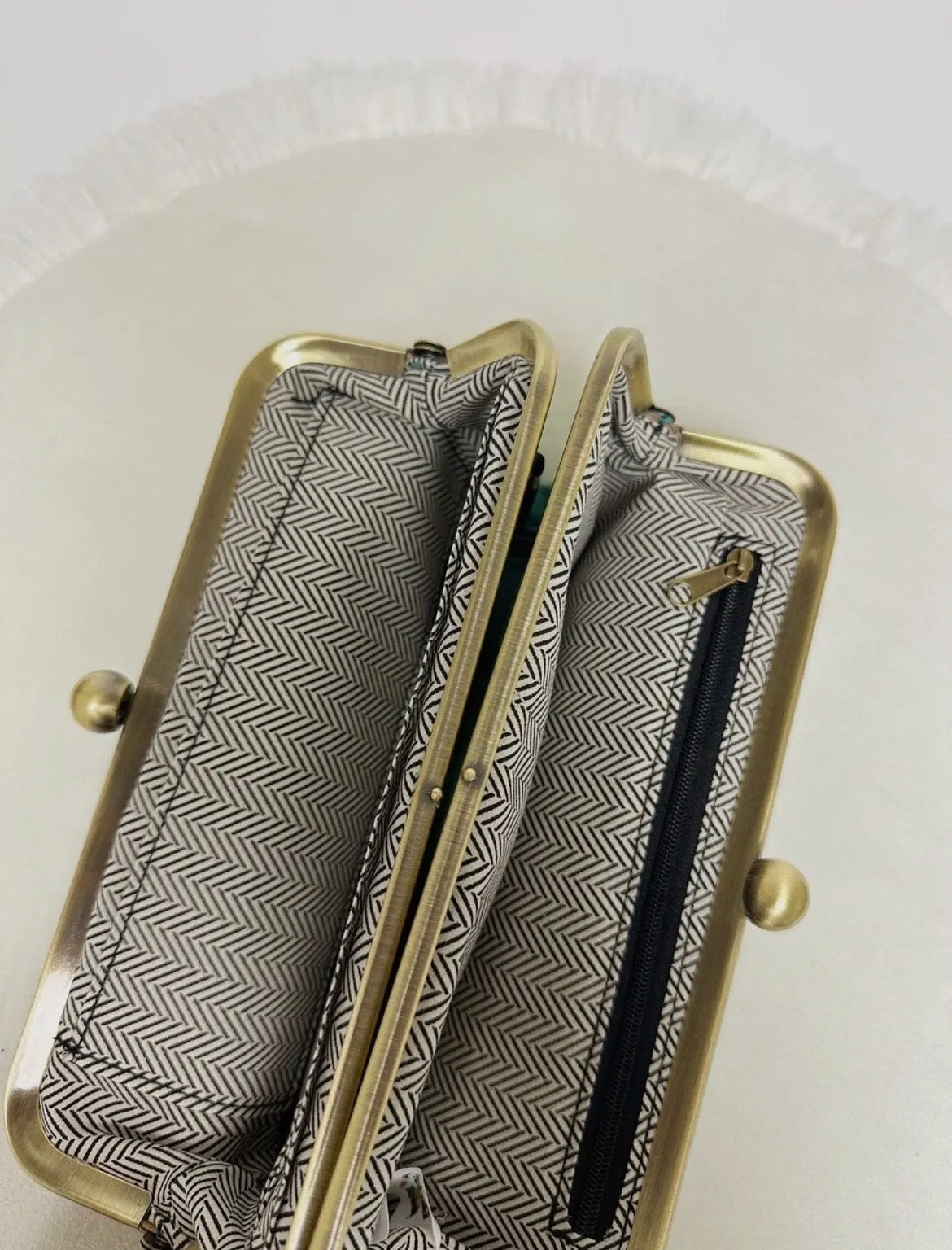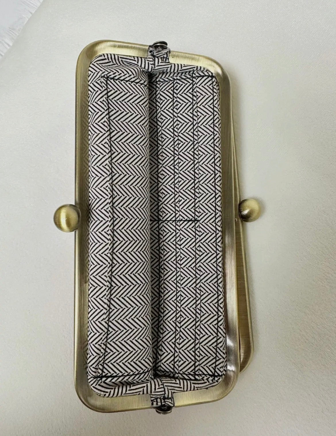 This Clutch is your go-to for keeping your evening essentials. Upgrade your ensemble with this sophisticated yet stylish clutch, perfect for any occasion big or small! * DISCLAIMER: some customers have had trouble opening wallets. wallets open correctly but please lift up the little ball, pulling it towards you and then open it outwards. Two top frame compartments with clasp closure * One side compartment includes a zip pocket and the other includes 8 card slots and slip pocket * Lining features three card slots, a zip pocket and ID holder with covered magnetic tab closure * Fits cellphone * Bronze hardware * L 8.7 * H 4.9 * W 1