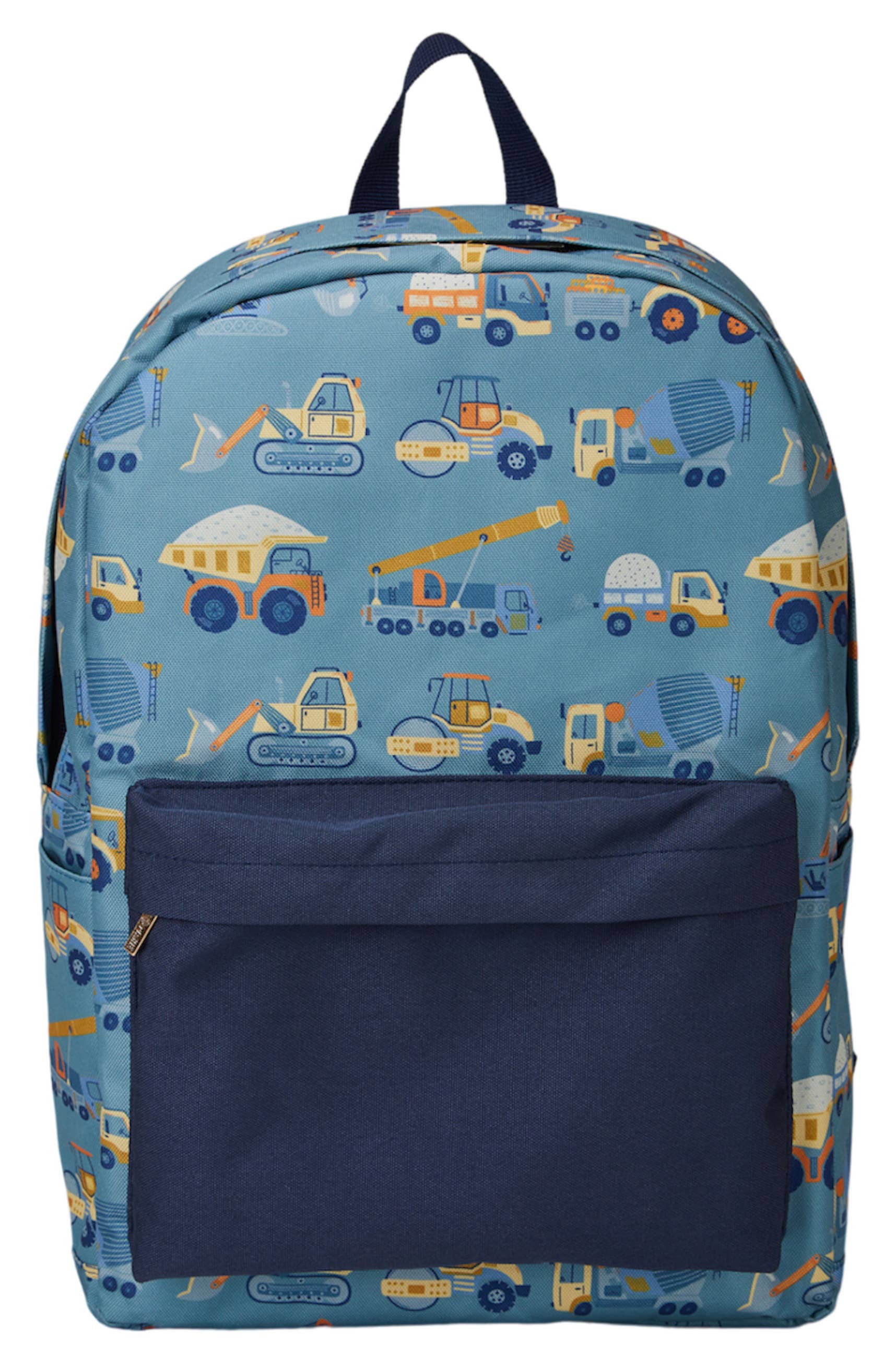 Kids construction crew backpack, water resistant canvas, 11" l x 5.5" W x 16" h.